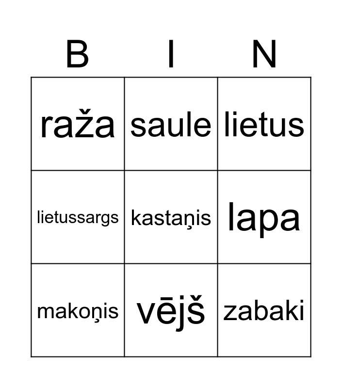 This bingo card has a free space and 8 words: lapa, lietus, saule, makoņis, raža, zabaki, lietussargs and vējš.