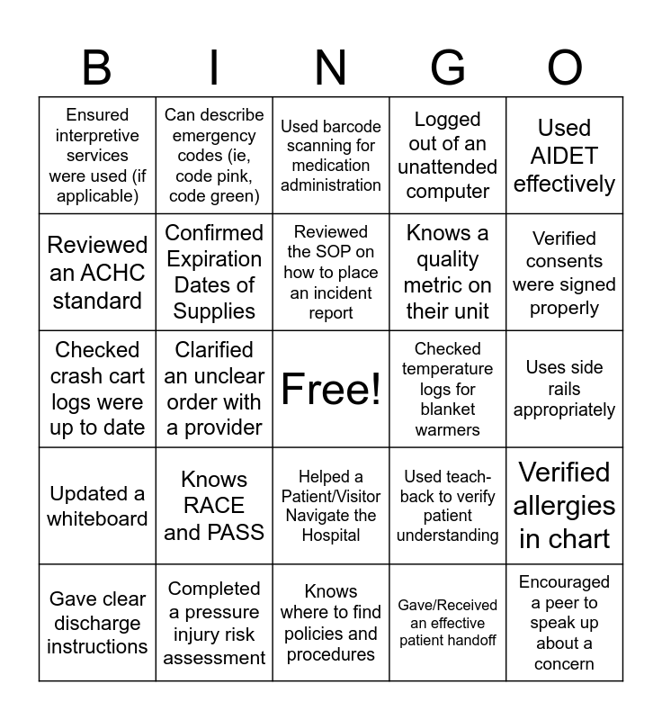 This bingo card has a free space and 35 words: Performed Proper Hand Hygiene, Reported a Good Catch, Sanitized a Shared Workstation/Device, Confirmed Expiration Dates of Supplies, Helped a Patient/Visitor Navigate the Hospital, Logged out of an unattended computer, Reviewed an ACHC standard, Placed Personal Drink in the Hydration Station, Reviewed the SOP on how to place an incident report, Double-checked a patient ID, Checked crash cart logs were up to date, Used AIDET effectively, Reviewed your units KPI board, Advocated for a patient's needs/wishes, Ensured interpretive services were used (if applicable), Checked temperature logs for blanket warmers, Gave/Received an effective patient handoff, Clarified an unclear order with a provider, Updated a whiteboard, Encouraged a peer to speak up about a concern, Used teach-back to verify patient understanding, Gave clear discharge instructions, Verified allergies in chart, Completed a pressure injury risk assessment, Used barcode scanning for medication administration, Verified consents were signed properly, Cleared clutter/trash out of a patient room, Knows the hospital mission statement, Knows a quality metric on their unit, Uses side rails appropriately, Can name one survey domain (unit specific), Knows where to find policies and procedures, Knows RACE and PASS, Can describe emergency codes (ie, code pink, code green) and Locates the nearest fire extinguisher.