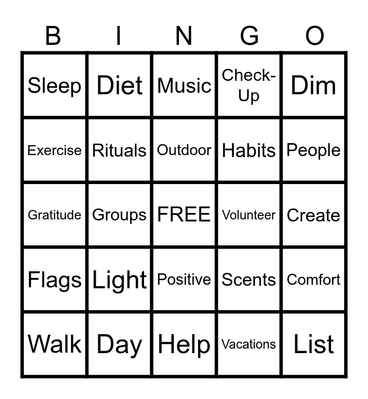 This bingo card has a free space and 24 words: Light, Day, Outdoor, Walk, Dim, Sleep, Exercise, Diet, Volunteer, Positive, Habits, Gratitude, Scents, Comfort, Rituals, Vacations, Create, Music, People, Groups, List, Flags, Check-Up and Help.