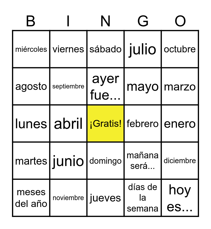 This bingo card has a free space and 24 words: junio, noviembre, ayer fue..., meses del año, octubre, miércoles, agosto, viernes, febrero, domingo, mayo, lunes, mañana será..., diciembre, septiembre, días de la semana, enero, sábado, marzo, abril, hoy es..., martes, julio and jueves.