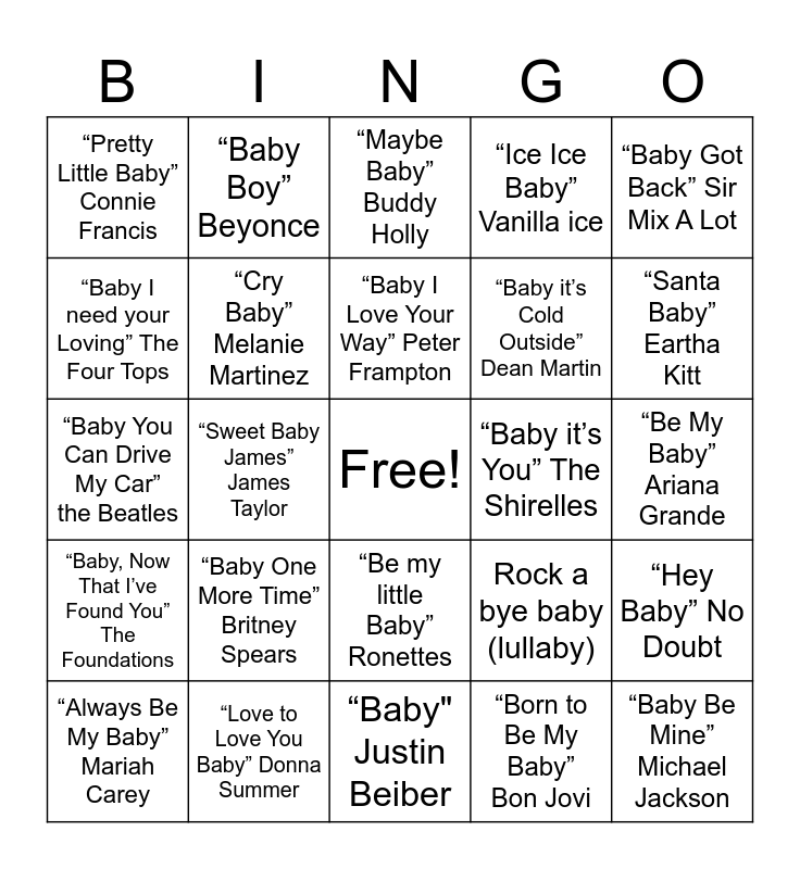 This bingo card has a free space and 25 words: “Baby One More Time” Britney Spears, “Baby" Justin Beiber, “Baby I Love Your Way” Peter Frampton, “Always Be My Baby” Mariah Carey, “Baby Got Back” Sir Mix A Lot, “Pretty Little Baby” Connie Francis, “Baby I need your Loving” The Four Tops, “Baby Boy” Beyonce, “Baby it’s You” The Shirelles, “Be my little Baby” Ronettes, “Baby it’s Cold Outside” Dean Martin, “Baby You Can Drive My Car” the Beatles, Rock a bye baby (lullaby), “Hey Baby” No Doubt, “Cry Baby” Melanie Martinez, I’m Your Baby Tonight Whitney Houston, “Be My Baby” Ariana Grande, “Maybe Baby” Buddy Holly, “Santa Baby” Eartha Kitt, “Sweet Baby James” James Taylor, “Baby Be Mine” Michael Jackson, “Love to Love You Baby” Donna Summer, “Baby, Now That I’ve Found You” The Foundations, “Ice Ice Baby” Vanilla ice and “Born to Be My Baby” Bon Jovi.