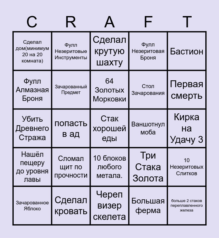 This bingo card has a free space and 29 words: Зачарованное Яблоко, алмазы, попасть в ад, пройти игру, Сделал дом(минимум 20 на 20 комната), Сделал крутую шахту, Зачарованный Предмет, Сломал щит по прочности, Ваншотнул моба, Сделал кровать, Кирка на Удачу 3, больше 2 стаков переплавленного железа, Череп визер скелета, Большая ферма, Первая смерть, Незеритовый Лом, 10 блоков любого метала., Нашёл пещеру до уровня лавы, Бастион, Убить Древнего Стража, Три Стака Золота, Убить Визера, Стол Зачарования, Фулл Алмазная Броня, Фулл Незеритовая Броня, Фулл Незеритовые Инструменты, 10 Незеритовых Слитков, 64 Золотых Морковки and 20 Золотых Яблок.