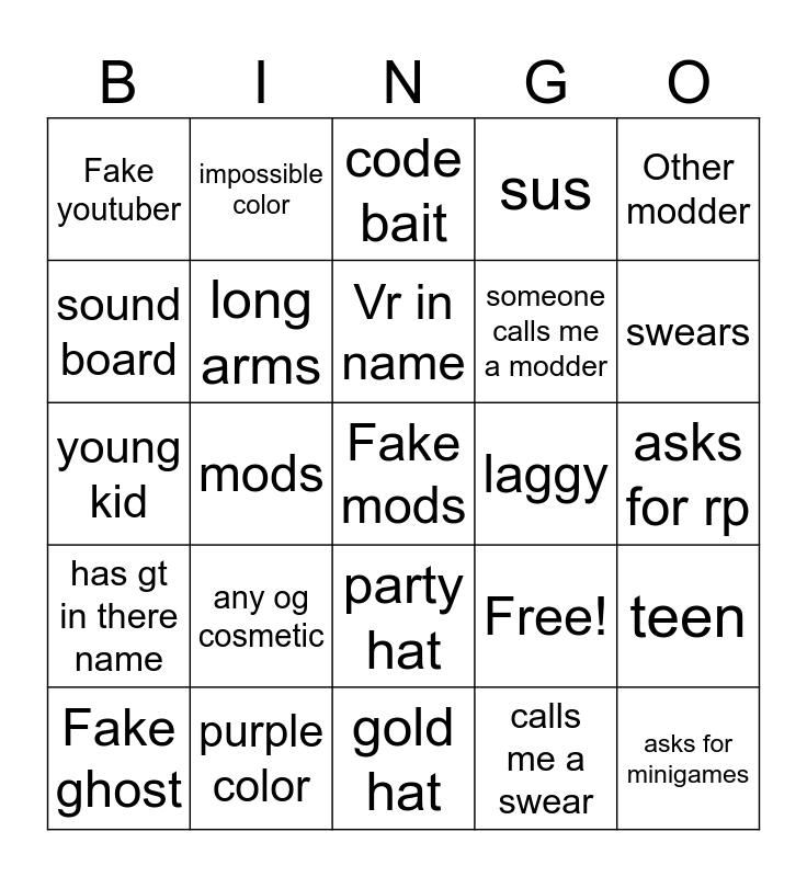 This bingo card has 25 words: any og cosmetic, gold hat, Vr in name, Fake ghost, Other modder, Fake youtuber, sound board, impossible color, laggy, party hat, someone calls me a modder, young kid, Free!, teen, long arms, asks for minigames, asks for rp, code bait, swears, mods, Fake mods, purple color, has gt in there name, sus and calls me a swear.