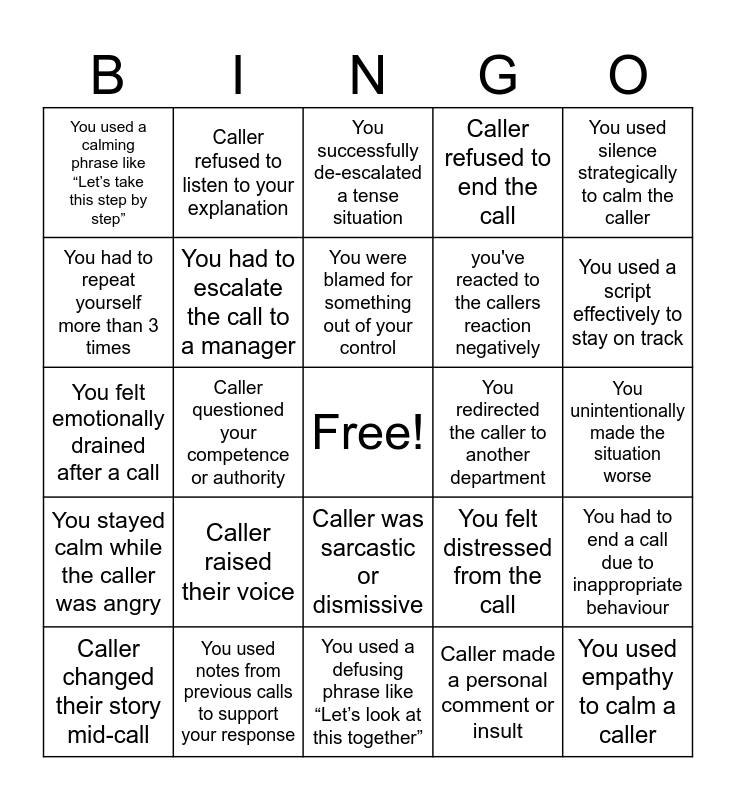 This bingo card has a free space and 24 words: Caller raised their voice, You used notes from previous calls to support your response, You were blamed for something out of your control, Caller changed their story mid-call, You used silence strategically to calm the caller, You used a calming phrase like “Let’s take this step by step”, You had to repeat yourself more than 3 times, Caller refused to listen to your explanation, You redirected the caller to another department, Caller was sarcastic or dismissive, you've reacted to the callers reaction negatively, You felt emotionally drained after a call, You felt distressed from the call, You had to end a call due to inappropriate behaviour, You had to escalate the call to a manager, Caller made a personal comment or insult, You unintentionally made the situation worse, You successfully de-escalated a tense situation, You used a script effectively to stay on track, Caller questioned your competence or authority, You used empathy to calm a caller, You stayed calm while the caller was angry, Caller refused to end the call and You used a defusing phrase like “Let’s look at this together”.