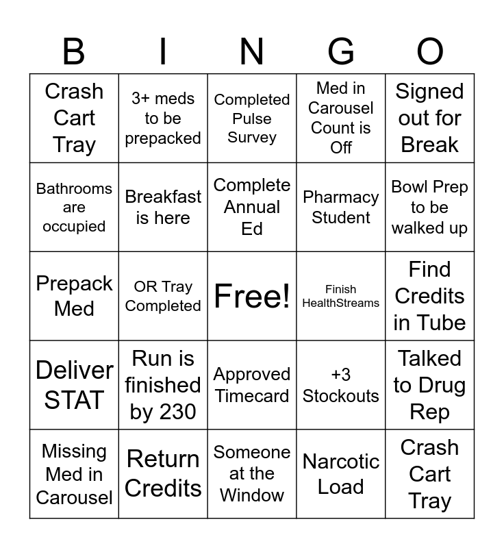 This bingo card has a free space and 34 words: Oral Syringe, Narcotic Load, Compound a Medication, Check Email, Deliver STAT, Breakfast is here, Signed out for Break, Missing Med in Carousel, 3+ meds to be prepacked, "I have a STAT", Complete Annual Ed, Completed Pulse Survey, Carols Crack, Lunch is here, Finish HealthStreams, Bowl Prep to be walked up, Return Credits, Prepack Med, Run is finished by 230, +3 Stockouts, Approved Timecard, Hand Label to Charge, Crash Cart Tray, Find Credits in Tube, Someone at the Window, Crash Cart Tray, Med in Carousel Count is Off, 3+ people in supervisor office, Pharmacy Student, Bathrooms are occupied, Bathroom available, OR Tray Completed, Talked to Drug Rep and Can't Find Pen.