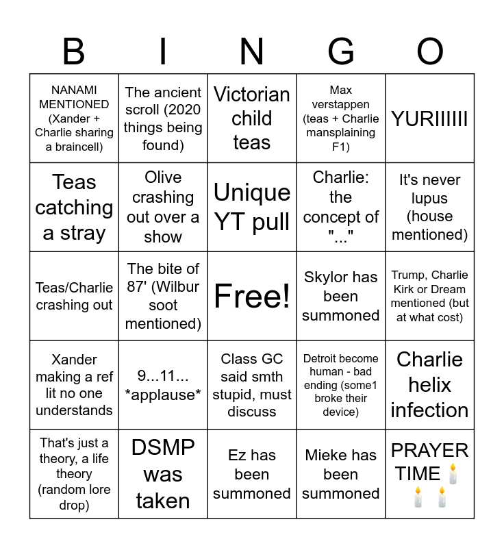 This bingo card has a free space and 24 words: 9...11... *applause*, DSMP was taken, Unique YT pull, That's just a theory, a life theory (random lore drop), YURIIIIII, NANAMI MENTIONED (Xander + Charlie sharing a braincell), Teas catching a stray, The ancient scroll (2020 things being found), Skylor has been summoned, Class GC said smth stupid, must discuss, Charlie: the concept of "...", Teas/Charlie crashing out, Detroit become human - bad ending (some1 broke their device), Charlie helix infection, Olive crashing out over a show, Mieke has been summoned, Trump, Charlie Kirk or Dream mentioned (but at what cost), Victorian child teas, It's never lupus (house mentioned), The bite of 87' (Wilbur soot mentioned), PRAYER TIME🕯️🕯️🕯️, Xander making a ref lit no one understands, Max verstappen (teas + Charlie mansplaining F1) and Ez has been summoned.