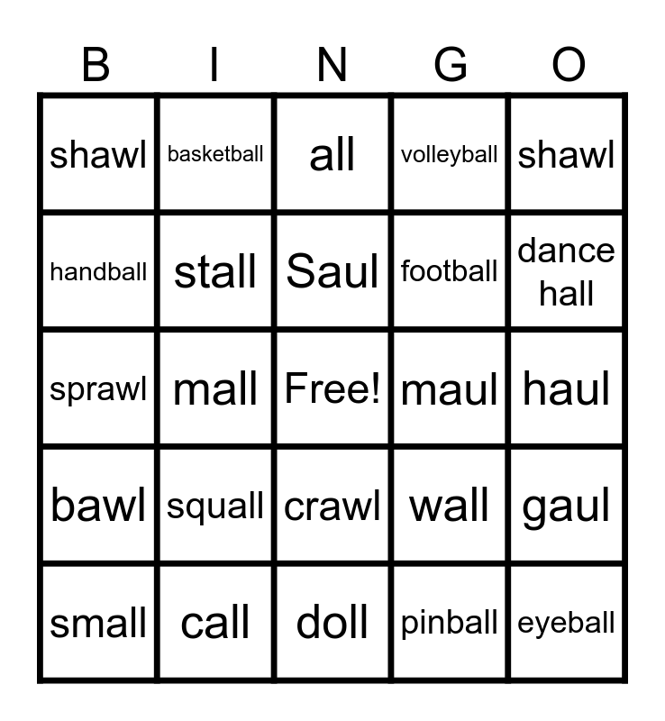 This bingo card has a free space and 30 words: call, fall, mall, tall, shawl, all, stall, crawl, maul, doll, haul, eyeball, pinball, drywall, dance hall, brawl, wall, bawl, squall, shawl, sprawl, baseball, basketball, football, handball, volleyball, gaul, small, Saul and y'all.