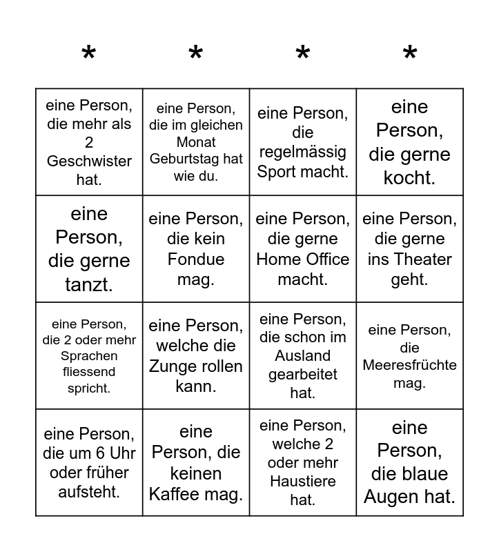 This bingo card has 16 words: eine Person, die keinen Kaffee mag., eine Person, die Meeresfrüchte mag., eine Person, die regelmässig Sport macht., eine Person, die mehr als 2 Geschwister hat., eine Person, die 2 oder mehr Sprachen fliessend spricht., eine Person, die im gleichen Monat Geburtstag hat wie du., eine Person, die schon im Ausland gearbeitet hat., eine Person, welche 2 oder mehr Haustiere hat., eine Person, die gerne tanzt., eine Person, die kein Fondue mag., eine Person, die um 6 Uhr oder früher aufsteht., eine Person, die gerne kocht., eine Person, welche die Zunge rollen kann., eine Person, die gerne ins Theater geht., eine Person, die gerne Home Office macht. and eine Person, die blaue Augen hat..