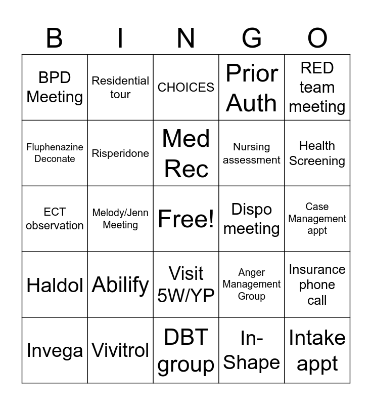 This bingo card has a free space and 29 words: Invega, Dorso gluteal injection, Melody/Jenn Meeting, Zoom Hospital discharge meeting, BPD Meeting, CHOICES, Risperidone, Abilify, Dispo meeting, Vivitrol, Case Management appt, Intake appt, DBT group, In-Shape, Health Screening, AIMS, Visit 5W/YP, Haldol, RED team meeting, ECT observation, Anger Management Group, Hospital Discharge appt, Nursing assessment, Fluphenazine Deconate, Prior Auth, Residential tour, Insurance phone call, Med Rec and Review labwork.