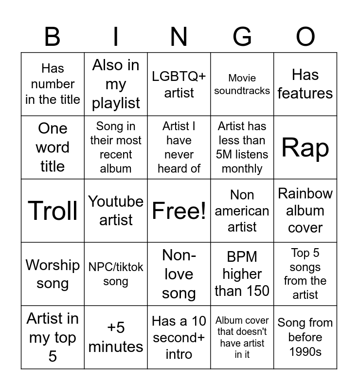 This bingo card has a free space and 24 words: NPC/tiktok song, +5 minutes, Artist I have never heard of, Artist in my top 5, Has features, Has number in the title, One word title, Also in my playlist, Non american artist, Non-love song, Artist has less than 5M listens monthly, Troll, BPM higher than 150, Top 5 songs from the artist, Song in their most recent album, Album cover that doesn't have artist in it, Rainbow album cover, LGBTQ+ artist, Rap, Youtube artist, Song from before 1990s, Worship song, Movie soundtracks and Has a 10 second+ intro.