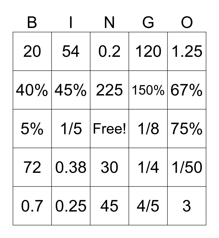 This bingo card has a free space and 30 words: 0.25, 60%, 1/5, 12, 20, 0.2, 45%, 30, 1/8, 45, 75%, 3, 4/5, 125, 67%, 30, 1/4, 72, 0.38, 1.25, 5%, 0.13, 54, 150%, 40%, 120, 1/50, 0.7, 225 and 0.4.