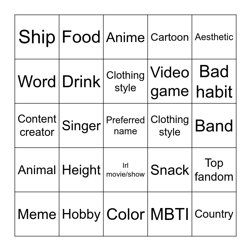 This bingo card has a free space and 24 words: Height, Hobby, Clothing style, Meme, Aesthetic, Ship, Word, Food, Clothing style, Irl movie/show, Video game, Content creator, Snack, Top fandom, Drink, MBTI, Band, Anime, Bad habit, Singer, Country, Animal, Cartoon and Color.