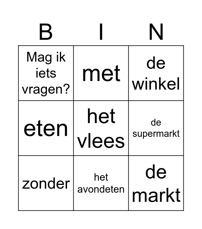 This bingo card has 15 words: het ontbijt, kopen, de winkel, Mag ik iets vragen?, het avondeten, het vlees, de lunch, de bakker, de supermarkt, de markt, kopen, eten, zonder, met and drinken.