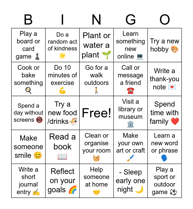 This bingo card has a free space and 25 words: Read a book π, Help someone at home π€, Go for a walk outdoors πΆ, Write a short journal entry βοΈ, Try a new hobby π¨, Play a board or card game βοΈ, Cook or bake something π³, Do a random act of kindness π, Visit a library or museum ποΈ, Clean or organise your room π§Ί, Call or message a friend βοΈ, Spend a day without screens π΅, Make your own art or craft ποΈ, Learn a new word or phrase π£οΈ, Do 10 minutes of exercise πͺ, Watch a meaningful movie π¬, Spend time with family β€οΈ, Plant or water a plant π±, Write a thank-you note π, Try a new food /drinksπ, Play a sport or outdoor game β½, Reflect on your goals π, Make someone smile π, Learn something new online π» and - Sleep early one night π.