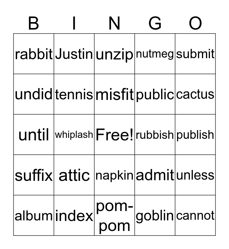 This bingo card has a free space and 30 words: index, mascot, whiplash, muffin, rabbit, unzip, tennis, napkin, rubbish, pom-pom, publish, cannot, goblin, picnic, cactus, combat, admit, suffix, attic, submit, until, confess, Justin, public, undid, nutmeg, unless, album, misfit and humbug.
