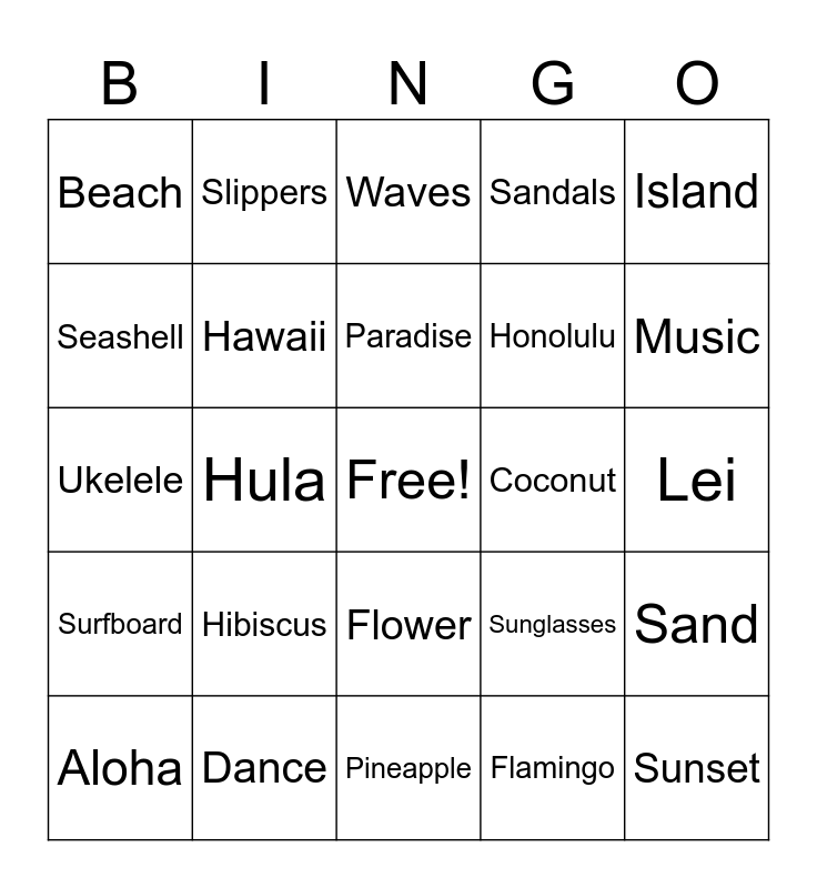 This bingo card has a free space and 24 words: Aloha, Hibiscus, Paradise, Flamingo, Island, Beach, Slippers, Waves, Coconut, Lei, Ukelele, Hawaii, Sunglasses, Sand, Seashell, Dance, Pineapple, Sandals, Music, Surfboard, Hula, Flower, Honolulu and Sunset.