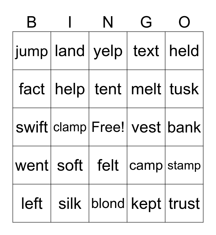 This bingo card has a free space and 24 words: soft, silk, tent, left, held, jump, fact, land, vest, felt, melt, swift, camp, stamp, help, kept, bank, yelp, tusk, clamp, trust, went, text and blond.