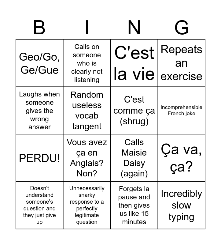 This bingo card has 16 words: Unnecessarily snarky response to a perfectly legitimate question, Ça va, ça?, C'est la vie, Geo/Go, Ge/Gue, PERDU!, Calls on someone who is clearly not listening, Calls Maisie Daisy (again), Forgets la pause and then gives us like 15 minutes, Laughs when someone gives the wrong answer, Random useless vocab tangent, Doesn't understand someone's question and they just give up, Repeats an exercise, Vous avez ça en Anglais? Non?, Incomprehensible French joke, C'est comme ça (shrug) and Incredibly slow typing.