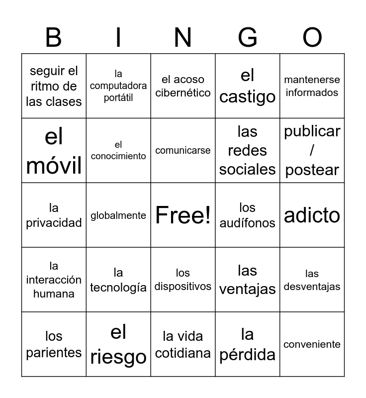 This bingo card has a free space and 25 words: la tecnología, la vida cotidiana, comunicarse, los parientes, mantenerse informados, seguir el ritmo de las clases, el móvil, la computadora portátil, los audífonos, los dispositivos, las redes sociales, la privacidad, las ventajas, las desventajas, el conocimiento, la sociedad, adicto, el acoso cibernético, publicar / postear, globalmente, conveniente, el riesgo, la interacción humana, el castigo and la pérdida.