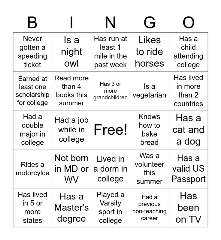 This bingo card has a free space and 34 words: Has worked at another school, Had a previous non-teaching career, Went to an out of state college, Flown in a hot air balloon, Rides a motorcylce, Read more than 4 books this summer, Has a child attending college, Has lived in 5 or more states, Is a night owl, Attended a summer workshop, Has 3 or more grandchildren, Has run at least 1 mile in the past week, Was born in the Swingin' 60's, Graduated college in less than 4 years, Knows how to bake bread, Has lived in more than 2 countries, Has a Master's degree, Had a double major in college, Not born in MD or WV, Was a volunteer this summer, Lived in a dorm in college, Grew some of their own food this summer, Never gotten a speeding ticket, Has a cat and a dog, Played a Varsity sport in college, Has been on TV, Likes to ride horses, Speaks at least 2 languages, Is a vegetarian, Earned at least one scholarship for college, Served in any branch of the US Military, Had a job while in college, Has a valid US Passport and Has less than 5 years until retirement.