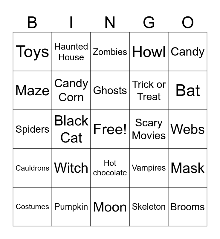 This bingo card has a free space and 24 words: Witch, Pumpkin, Ghosts, Costumes, Candy, Toys, Maze, Haunted House, Scary Movies, Hot chocolate, Trick or Treat, Spiders, Vampires, Mask, Candy Corn, Skeleton, Webs, Zombies, Bat, Black Cat, Brooms, Cauldrons, Howl and Moon.