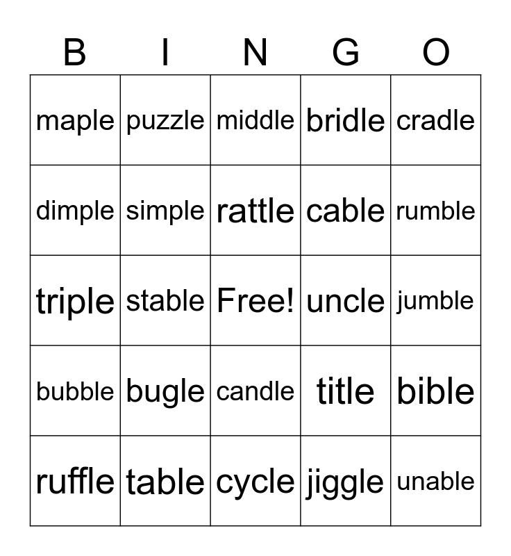 This bingo card has a free space and 24 words: bugle, table, rattle, ruffle, cradle, maple, dimple, puzzle, uncle, candle, cable, triple, title, bible, simple, jiggle, jumble, middle, rumble, stable, unable, bubble, bridle and cycle.