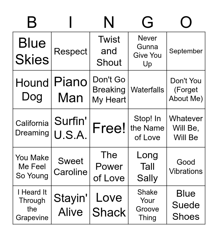 This bingo card has a free space and 31 words: Love Shack, Everybody Loves Somebody, Surfin' U.S.A., I Want You Back, Blue Skies, Twist and Shout, Piano Man, Long Tall Sally, Stop! In the Name of Love, Shake Your Groove Thing, Whatever Will Be, Will Be, Blue Suede Shoes, Eye of the Tiger, Walking on Sunshine, Don't You (Forget About Me), Please Mr PostmanCall Me, Good Vibrations, Sweet Caroline, You Make Me Feel So Young, The Power of Love, September, Dancing Queen, I Heard It Through the Grapevine, Respect, Waterfalls, Hound Dog, Never Gunna Give You Up, California Dreaming, Stayin' Alive, Don't Go Breaking My Heart and Faith.