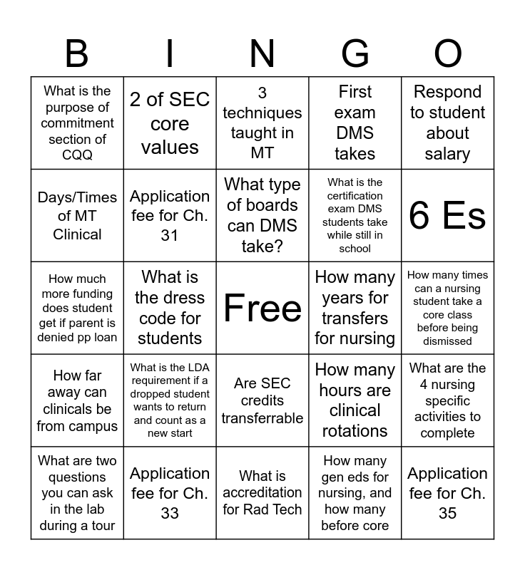 This bingo card has a free space and 24 words: What is the LDA requirement if a dropped student wants to return and count as a new start, Application fee for Ch. 33, What type of boards can DMS take?, What are two questions you can ask in the lab during a tour, Respond to student about salary, What is the purpose of commitment section of CQQ, Days/Times of MT Clinical, 2 of SEC core values, How many years for transfers for nursing, Are SEC credits transferrable, What is the certification exam DMS students take while still in school, How much more funding does student get if parent is denied pp loan, How many hours are clinical rotations, What are the 4 nursing specific activities to complete, Application fee for Ch. 31, How many gen eds for nursing, and how many before core, How many times can a nursing student take a core class before being dismissed, 3 techniques taught in MT, 6 Es, What is the dress code for students, Application fee for Ch. 35, How far away can clinicals be from campus, First exam DMS takes and What is accreditation for Rad Tech.