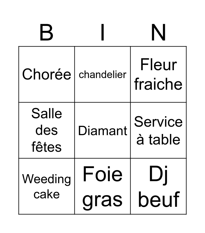 This bingo card has a free space and 8 words: Service à table, Fleur fraiche, chandelier, Weeding cake, Chorée, Dj beuf, Salle des fêtes and Foie gras.
