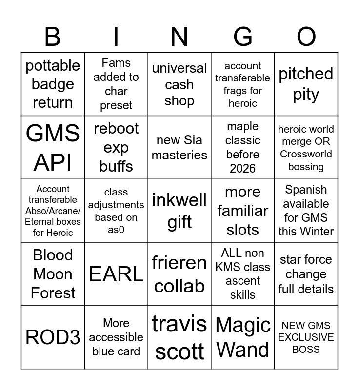 This bingo card has a free space and 24 words: EARL, More accessible blue card, new Sia masteries, ROD3, pitched pity, pottable badge return, GMS API, Fams added to char preset, more familiar slots, frieren collab, maple classic before 2026, Account transferable Abso/Arcane/ Eternal boxes for Heroic, ALL non KMS class ascent skills, star force change full details, reboot exp buffs, Magic Wand, Spanish available for GMS this Winter, universal cash shop, heroic world merge OR Crossworld bossing, class adjustments based on as0, NEW GMS EXCLUSIVE BOSS, Blood Moon Forest, account transferable frags for heroic and travis scott.
