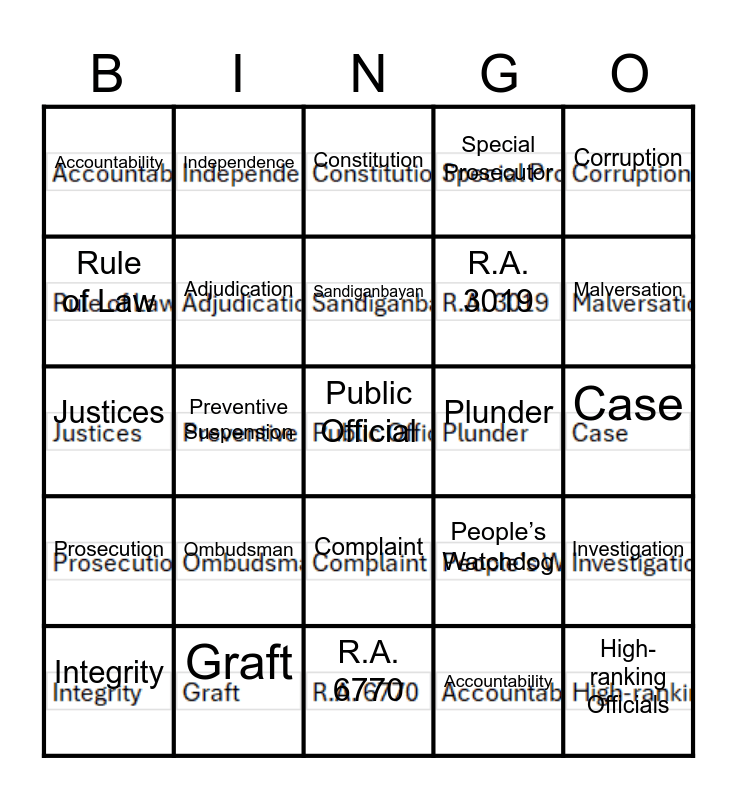 This bingo card has 25 images and 25 words: Ombudsman, R.A. 6770, Sandiganbayan, Integrity, Corruption, Accountability, Rule of Law, Independence, Plunder, Complaint, R.A. 3019, Justices, People’s Watchdog, Investigation, Adjudication, High-ranking Officials, Case, Constitution, Malversation, Preventive Suspension, Public Official, Graft, Prosecution, Special Prosecutor and Accountability.