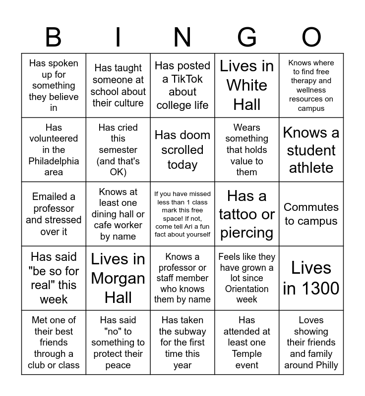 This bingo card has a free space and 24 words: Lives in Morgan Hall, Has said "no" to something to protect their peace, Has doom scrolled today, Met one of their best friends through a club or class, Knows where to find free therapy and wellness resources on campus, Has spoken up for something they believe in, Has volunteered in the Philadelphia area, Has taught someone at school about their culture, Has a tattoo or piercing, Knows a professor or staff member who knows them by name, Wears something that holds value to them, Emailed a professor and stressed over it, Feels like they have grown a lot since Orientation week, Lives in 1300, Has cried this semester (and that's OK), Has attended at least one Temple event, Commutes to campus, Has posted a TikTok about college life, Knows a student athlete, Knows at least one dining hall or cafe worker by name, Loves showing their friends and family around Philly, Has said "be so for real" this week, Lives in White Hall and Has taken the subway for the first time this year.