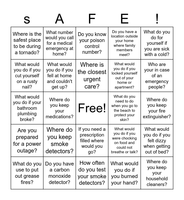 This bingo card has a free space and 24 words: Where do you keep smoke detectors?, Do you have a carbon monoxide detector?, Where is the closest urgent care?, What do you use to put out grease fires?, What do you do for yourself if you are sick with a cold?, Where is the safest place to be during a tornado?, What would you do if you cut yourself on a rusty nail?, What number would you call for a medical emergency at home?, What do you need to do when you go to the beach to protect your skin?, If you need a prescription filled where would you go?, What would you do if you locked yourself out of your home or apartment?, What would you do if your bathroom plumbing broke?, What would you do if you were chocking on food and could not breathe or talk?, What would you do if you felt dizzy when getting out of bed?, What would you do if you fell at home and couldn't get up?, What would you do if you burned your hand?, Where do you keep your fire extinguisher?, Do you know your poison control number?, Who are your in case of an emergency people?, Where do you keep your medications?, Where do you keep your household cleaners?, Are you prepared for a power outage?, Do you have a location outside your home where family members meet? and How often do you test your smoke detectors?.