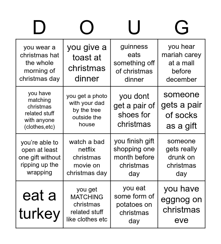 This bingo card has 18 words: watch a bad netflix christmas movie on christmas day, you have eggnog on christmas eve, guinness eats something off of christmas dinner, you wear a christmas hat the whole morning of christmas day, you finish gift shopping one month before christmas day, you hear mariah carey at a mall before december, eat a turkey, you give a toast at christmas dinner, someone gets a pair of socks as a gift, you’re able to open at least one gift without ripping up the wrapping, you eat some form of potatoes on christmas day, you have matching christmas related stuff with anyone (clothes,etc), someone gets really drunk on christmas day, you get a photo with your dad by the tree outside the house, you dont get a pair of shoes for christmas, something meant for christmas dinner is burnt/turns out bad, you get MATCHING christmas related stuff like clothes etc and you’re able to open at least one gift without ripping up the wrapping.