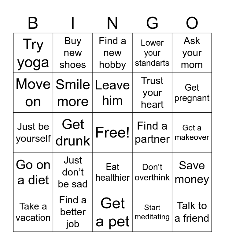 This bingo card has a free space and 24 words: Just don’t be sad, Find a better job, Leave him, Take a vacation, Ask your mom, Try yoga, Move on, Buy new shoes, Find a partner, Eat healthier, Trust your heart, Just be yourself, Don’t overthink, Save money, Smile more, Start meditating, Get a makeover, Find a new hobby, Get pregnant, Get drunk, Talk to a friend, Go on a diet, Lower your standarts and Get a pet.