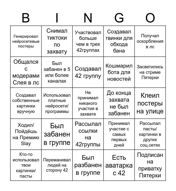 This bingo card has a free space and 24 words: Был забанен в группе, Переманивал людей на сторону 42, Создавал 42 группу, Кто-то использовал твои картинки/пасты, Получал оскорбления в лс, Генерировал нейросетевые постеры, Общался с модерами Слея в лс, Снимал тиктоки по захвату, До конца захвата не был забанен, Рассылал ссылки на 42группы, Кошмарил бота для новостей, Создавал собственные картинки вручную, Принимал участие с самых первых дней, Рассылал пасты/картинки в других соц.сетях, Был забанен в 5 или более каналах, Есть аватарка с 42, Клеил постеры на улице, Участвовал больше чем в трех 42группах, Засветились на стриме Пятерки, Использовал платные нейросети/программы, Подписан на приватку Пятерки, Ходил/Пойдёшь на Премию Slay, Создавал твинки для обхода бана and Был разбанен в группе.