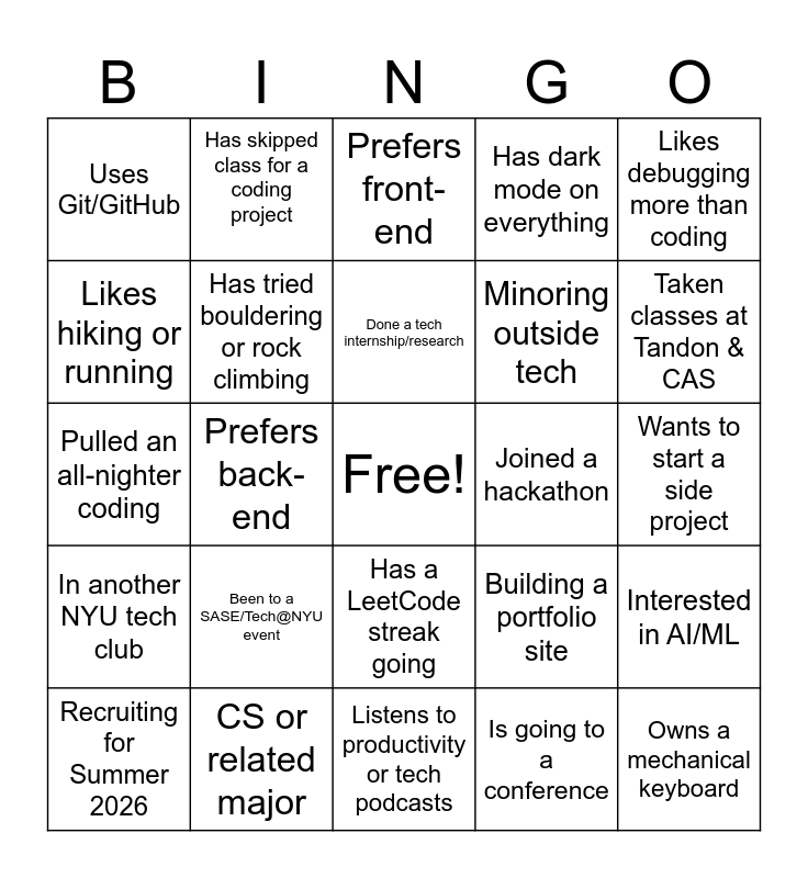 This bingo card has a free space and 24 words: Been to a SASE/Tech@NYU event, CS or related major, Done a tech internship/research, Recruiting for Summer 2026, Likes debugging more than coding, Uses Git/GitHub, Likes hiking or running, Has skipped class for a coding project, Joined a hackathon, Has a LeetCode streak going, Minoring outside tech, Pulled an all-nighter coding, Building a portfolio site, Interested in AI/ML, Has tried bouldering or rock climbing, Is going to a conference, Wants to start a side project, Prefers front-end, Taken classes at Tandon & CAS, Prefers back-end, Owns a mechanical keyboard, In another NYU tech club, Has dark mode on everything and Listens to productivity or tech podcasts.