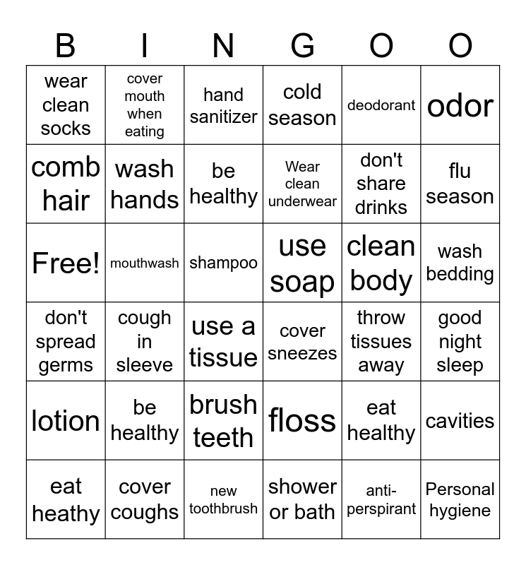 This bingo card has 36 words: floss, brush teeth, shower or bath, comb hair, don't spread germs, use soap, wash hands, new toothbrush, deodorant, eat healthy, flu season, cold season, cavities, mouthwash, Wear clean underwear, wear clean socks, lotion, clean body, Free!, hand sanitizer, shampoo, cough in sleeve, cover sneezes, use a tissue, throw tissues away, cover mouth when eating, don't share drinks, cover coughs, be healthy, odor, Personal hygiene, eat heathy, good night sleep, wash bedding, be healthy and anti-perspirant.