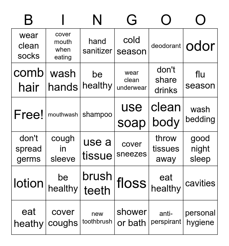 This bingo card has 36 words: floss, brush teeth, shower or bath, comb hair, don't spread germs, use soap, wash hands, new toothbrush, deodorant, eat healthy, flu season, cold season, cavities, mouthwash, wear clean underwear, wear clean socks, lotion, clean body, Free!, hand sanitizer, shampoo, cough in sleeve, cover sneezes, use a tissue, throw tissues away, cover mouth when eating, don't share drinks, cover coughs, be healthy, odor, personal hygiene, eat heathy, good night sleep, wash bedding, be healthy and anti-perspirant.