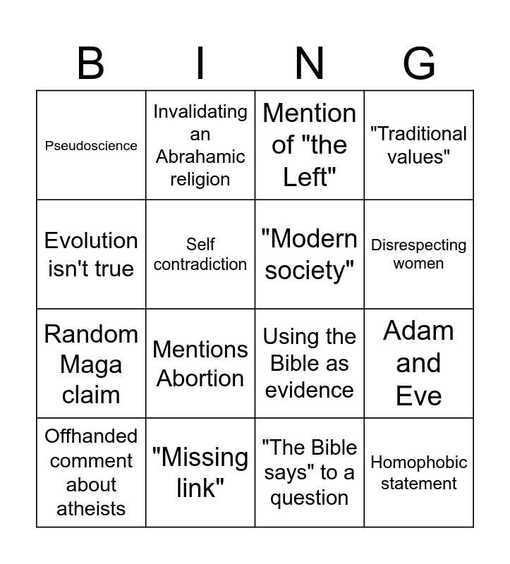 This bingo card has 16 words: "Missing link", Adam and Eve, Mention of "the Left", Pseudoscience, Random Maga claim, Invalidating an Abrahamic religion, Using the Bible as evidence, "The Bible says" to a question, Evolution isn't true, Self contradiction, Offhanded comment about atheists, "Traditional values", Mentions Abortion, Disrespecting women, "Modern society" and Homophobic statement.