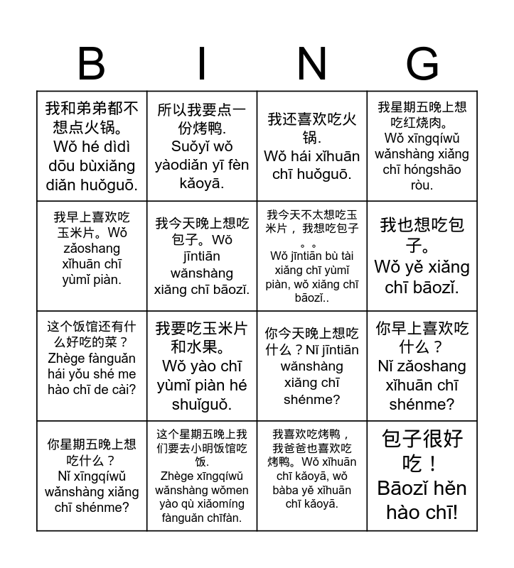 This bingo card has 16 words: 这个星期五晚上我们要去小明饭馆吃饭. Zhège xīngqíwǔ wǎnshàng wǒmen yào qù xiǎomíng fànguǎn chīfàn., 你早上喜欢吃什么? Nǐ zǎoshang xǐhuān chī shénme?, 我还喜欢吃火锅. Wǒ hái xǐhuān chī huǒguō., 我和弟弟都不想点火锅。Wǒ hé dìdì dōu bùxiǎng diǎn huǒguō., 这个饭馆还有什么好吃的菜? Zhège fànguǎn hái yǒu shé me hào chī de cài?, 所以我要点一份烤鸭. Suǒyǐ wǒ yàodiǎn yī fèn kǎoyā., 你今天晚上想吃什么?Nǐ jīntiān wǎnshàng xiǎng chī shénme?, 我喜欢吃烤鸭,我爸爸也喜欢吃烤鸭。Wǒ xǐhuān chī kǎoyā, wǒ bàba yě xǐhuān chī kǎoyā., 我早上喜欢吃玉米片。Wǒ zǎoshang xǐhuān chī yùmǐ piàn., 我今天晚上想吃包子。Wǒ jīntiān wǎnshàng xiǎng chī bāozǐ., 你星期五晚上想吃什么? Nǐ xīngqíwǔ wǎnshàng xiǎng chī shénme?, 我星期五晚上想吃红烧肉。 Wǒ xīngqíwǔ wǎnshàng xiǎng chī hóngshāo ròu., 我要吃玉米片和水果。 Wǒ yào chī yùmǐ piàn hé shuǐguǒ., 我也想吃包子。 Wǒ yě xiǎng chī bāozǐ., 我今天不太想吃玉米片, 我想吃包子 。。 Wǒ jīntiān bù tài xiǎng chī yùmǐ piàn, wǒ xiǎng chī bāozǐ.. and 包子很好吃! Bāozǐ hěn hào chī!.