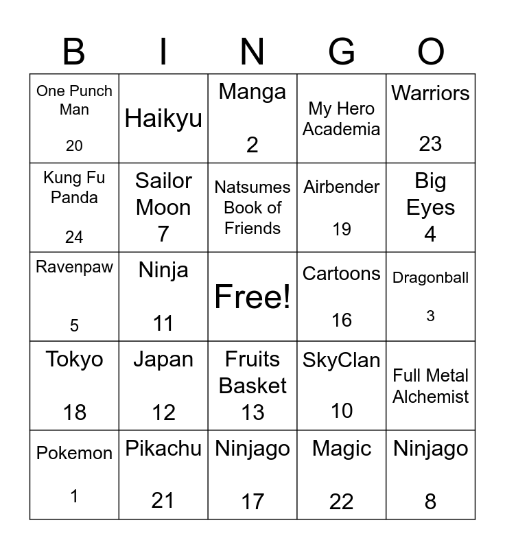 This bingo card has a free space and 29 words: Pokemon 1, Naruto 6, Ninja 11, Avatar 15, One Punch Man 20, Manga 2, Sailor Moon 7, Japan 12, Cartoons 16, Pikachu 21, Dragonball 3, Ninjago 8, Ninjago 17, Magic 22, Big Eyes 4, Bulbasaur 9, Fruits Basket 13, Tokyo 18, Warriors 23, Ravenpaw 5, SkyClan 10, Yotsuba 14, Airbender 19, Kung Fu Panda 24, My Hero Academia, Haikyu, Full Metal Alchemist, Natsumes Book of Friends and Cells at Work.