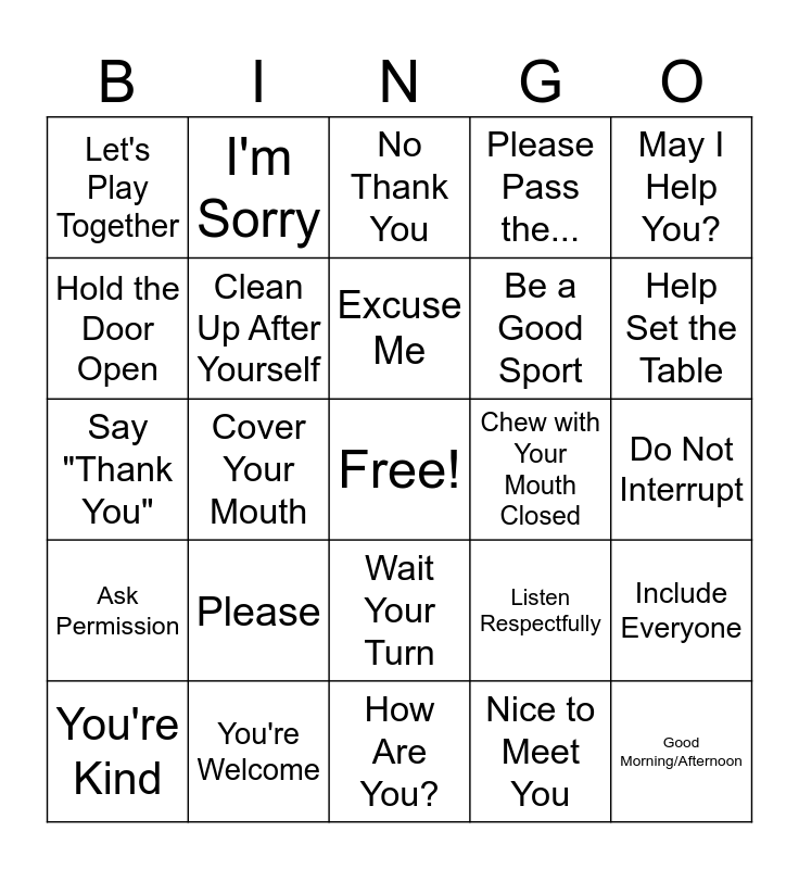 This bingo card has a free space and 24 words: Please, You're Welcome, Excuse Me, You're Kind, May I Help You?, Let's Play Together, Hold the Door Open, I'm Sorry, Chew with Your Mouth Closed, Wait Your Turn, Be a Good Sport, Say "Thank You", Listen Respectfully, Include Everyone, Clean Up After Yourself, Nice to Meet You, Do Not Interrupt, No Thank You, Help Set the Table, Cover Your Mouth, Good Morning/Afternoon, Ask Permission, Please Pass the... and How Are You?.