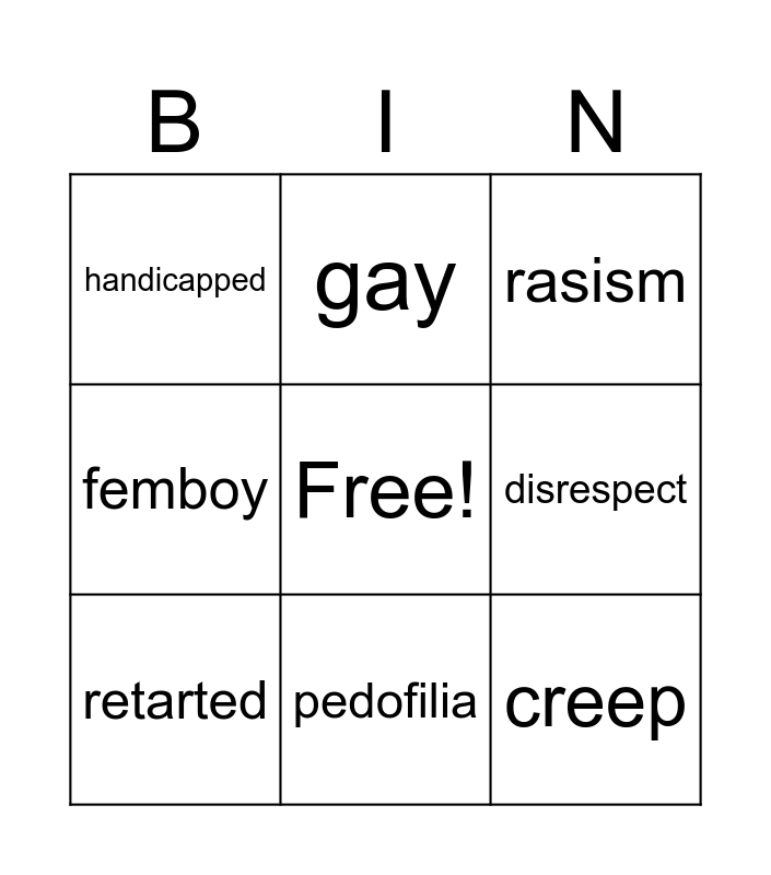 This bingo card has a free space and 8 words: disrespect, rasism, gay, retarted, handicapped, creep, femboy and pedofilia.