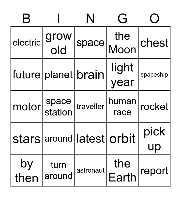 This bingo card has 25 words: around, astronaut, brain, by then, chest, electric, future, grow old, human race, latest, light year, motor, orbit, pick up, planet, report, rocket, space, spaceship, space station, traveller, turn around, stars, the Moon and the Earth.