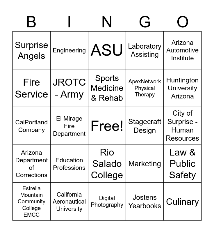 This bingo card has a free space and 51 words: Automotive, Culinary, Digital Animation, Digital Photography, Education Professions, Emergency Medical Services, Engineering, Film & TV Broadcasting, Fire Service, Graphic Design, JROTC - Army, Laboratory Assisting, Law & Public Safety, Marketing, Nursing Services, Software Dev & App Design, Sports Medicine & Rehab, Stagecraft Design, Technology Devices & Maintenance, Arizona Automotive Institute, El Mirage Fire Department, Jostens Yearbooks, Surprise Angels, ApexNetwork Physical Therapy, City of Surprise Human Service & Community Vitality, West-MEC, Huntington University Arizona, UTI Universal Technical Institute, Estrella Mountain Community College EMCC, ASU, Grand Canyon University, University of Alabama, NAU, The Refigeration School-RSI, Ottowa University, California Aeronautical University, Marine Corp, Air Force, Dysart Education Foundation, Maricopa County AZ@Work, City of Surprise - Human Resources, Arizona Department of Corrections, Associated Minority Contractors of Arizona, El Mirage Police Department Cadet Program, Jobs for Arizona’s Graduates (JAG), Surprise Fire Medical Department, CalPortland Company, Thunderbird School of Global Management (ASU), Coding in Color, Rio Salado College and The Studio Academy of Beauty.