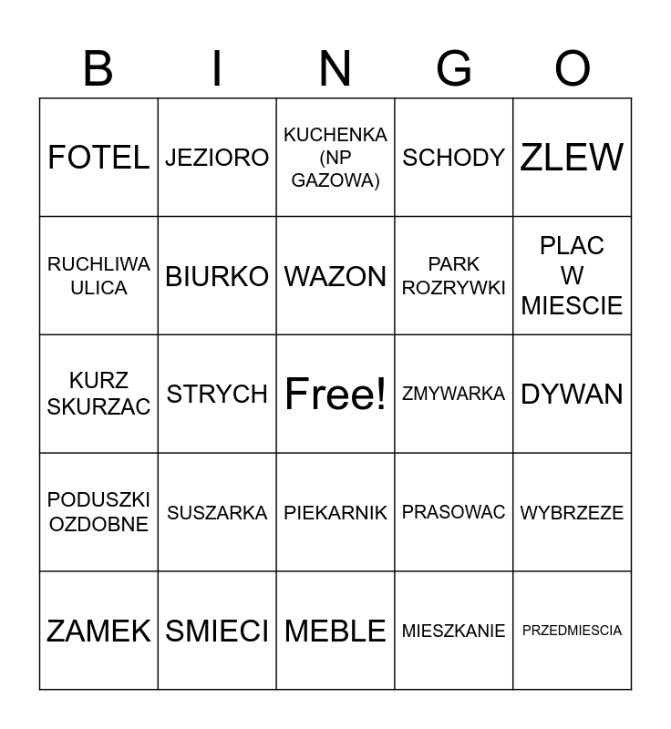 This bingo card has a free space and 29 words: ZAMEK, WIEZOWIEC, STRYCH, SYPIALNIA, FOTEL, KUCHENKA (NP GAZOWA), BIURKO, SUSZARKA, ZMYWARKA, SMIECI, DYWAN, PRZEDMIESCIA, MEBLE, MIESZKANIE, PLAC W MIESCIE, ODKURZACZ, PIEKARNIK, PODUSZKI OZDOBNE, ZLEW, KURZ SKURZAC, PRASOWAC, SASIEDZTWO OKOLICA, PARK ROZRYWKI, RUCHLIWA ULICA, SCHODY, JEZIORO, WYBRZEZE, WAZON and PODUSZKI DO SPANIA.