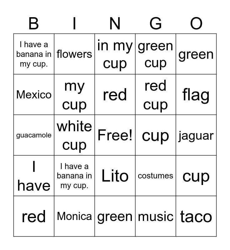 ⚠ This card has duplicate items: I have (2), a banana (2), in my cup (2), my cup (2), cup (2), I have a banana in my cup. (2), red (2), white (2), green (2), red cup (2), white cup (2), green cup (2), taco (2), jaguar (2)