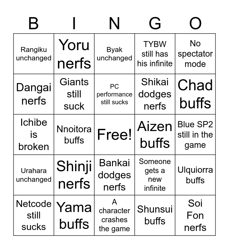 This bingo card has a free space and 24 words: Shinji nerfs, Yama buffs, PC performance still sucks, Netcode still sucks, No spectator mode, Rangiku unchanged, Dangai nerfs, Yoru nerfs, Aizen buffs, Bankai dodges nerfs, Shikai dodges nerfs, Ichibe is broken, Someone gets a new infinite, Ulquiorra buffs, Giants still suck, Shunsui buffs, Blue SP2 still in the game, Byak unchanged, Chad buffs, Nnoitora buffs, Soi Fon nerfs, Urahara unchanged, TYBW still has his infinite and A character crashes the game.