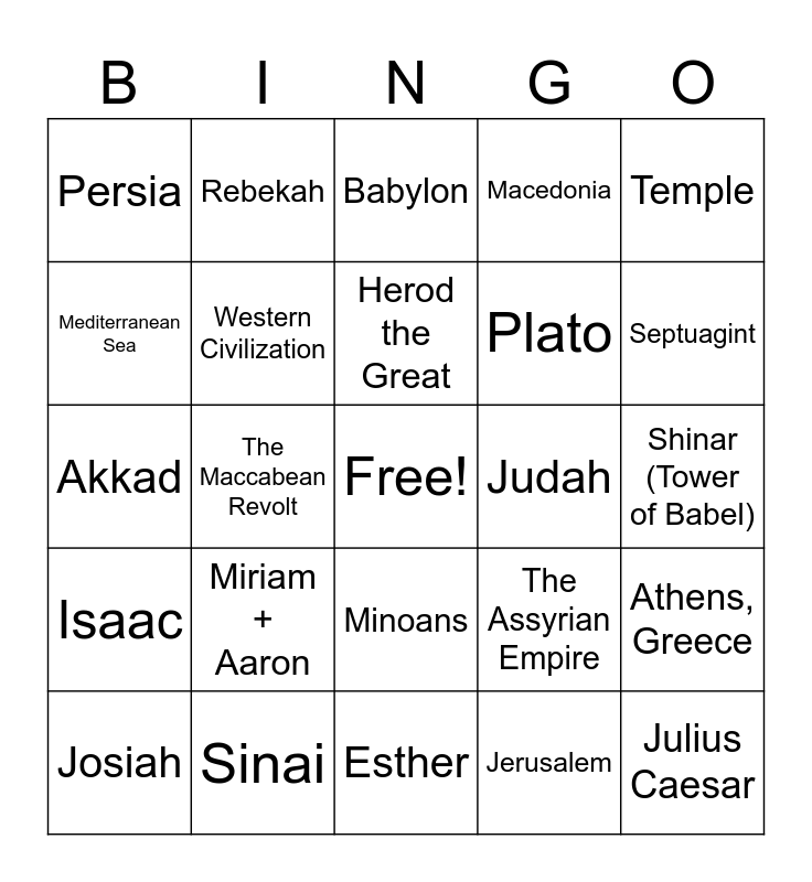 This bingo card has a free space and 57 words: Mesopotamia, Josiah, Hammurabi + Nebuchadnezzar, Persia, Esther, Confucius, Western Civilization, Asking Questions, Plato, Logic, Macedonia, Alexander the Great, Egypt, Africa, Museum, The Great Wall, Shi Huang Di, Temple, The Maccabean Revolt, Forum, Julius Caesar, Judah, Camels, The Assyrian Empire, Babylon, Jesus, Herod the Great, Judas Iscariot, The Dead Sea, Septuagint, Caesar Augustus, Hieroglyphics, Antiochus IV Epiphines, Hellenism, Raven + Dove, Shinar (Tower of Babel), Mediterranean Sea, Giza, Akkad, Cuneiform, Isaac, Rebekah, Minoans, Ur, England, Ancient China, Famine, Miriam + Aaron, Sinai, Egypt, Sparta + Troy, Saul, Jerusalem, Phoenicians, Books, Purple dye, Athens, Greece and Assyria.